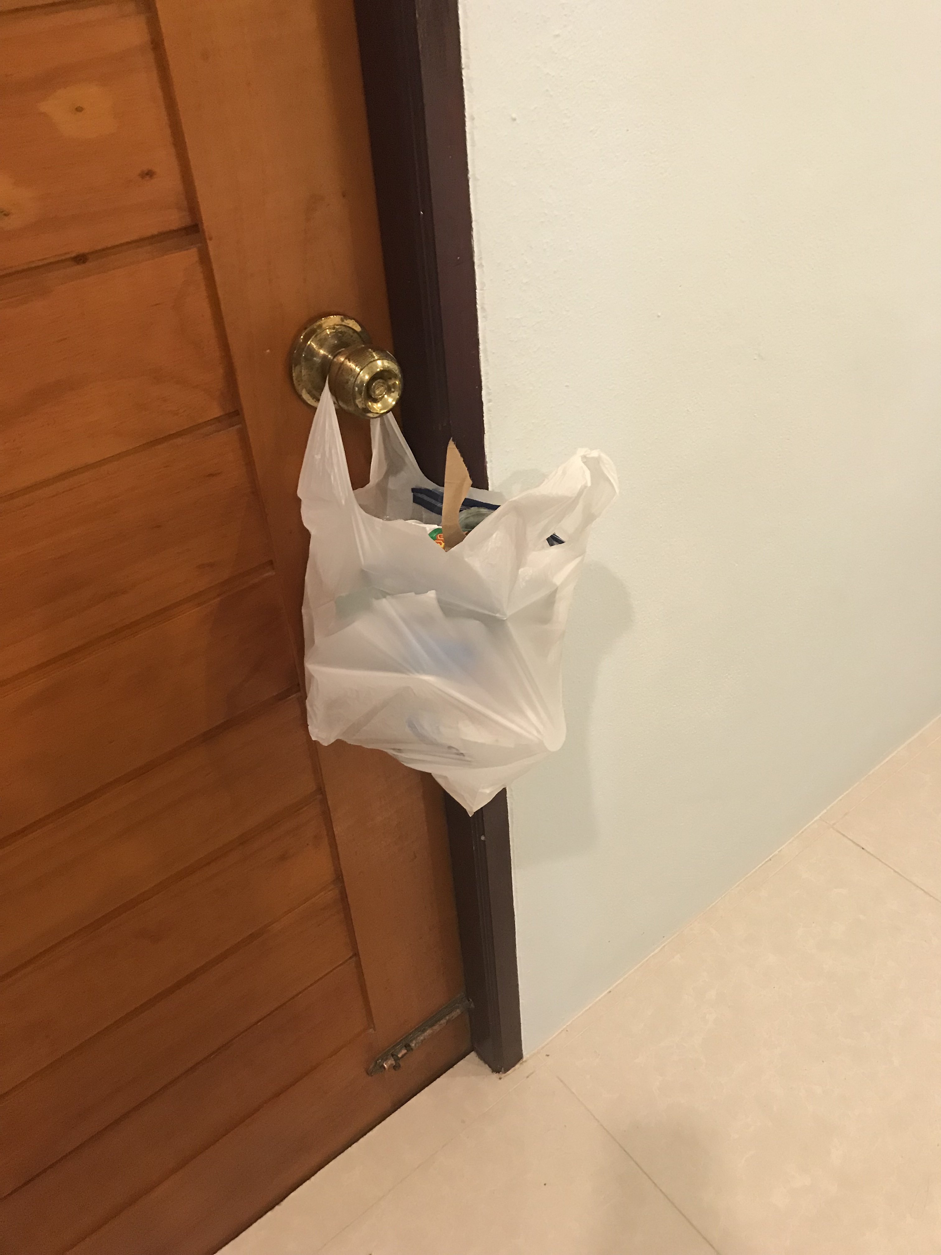 There is no bin in the room, so we have been utilizing the plastic bags we’ve been getting here and there. As seen on the picture.