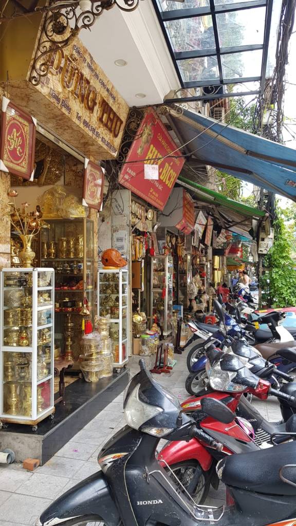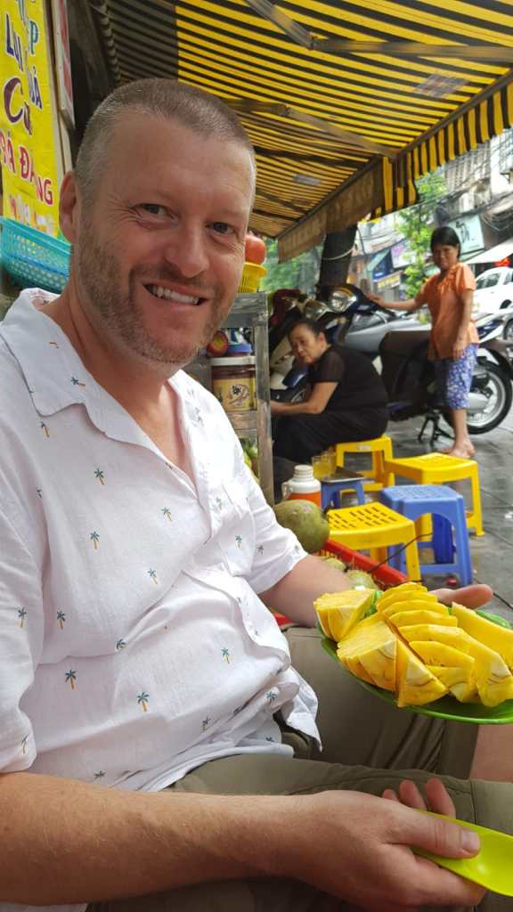 Here in Hanoi, there are no Starbucks or Mc Donald’s anywhere. Instead there are stalls all around the Old Quarter for people to sit on a stool on the pavement and have a bite or a drink. The food served is always tasty and cheap. When we had a “pineapple break”, see how these ladies are looking at Andy. ..