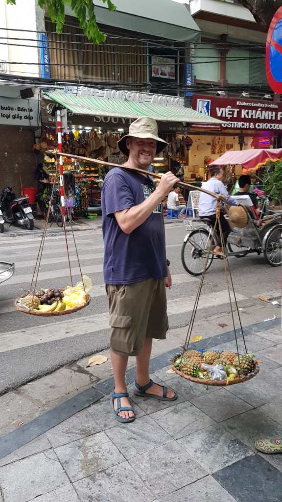 There are old ladies walking around selling fruit on their “plates balanced on a stick, looking like scales thingy”, who can be a bit opportunist when they see tourists. They call those things Quang Ganh. In case you don’t know what I’m talking about, here is Andy demonstrating it for you…