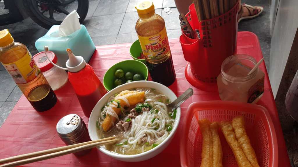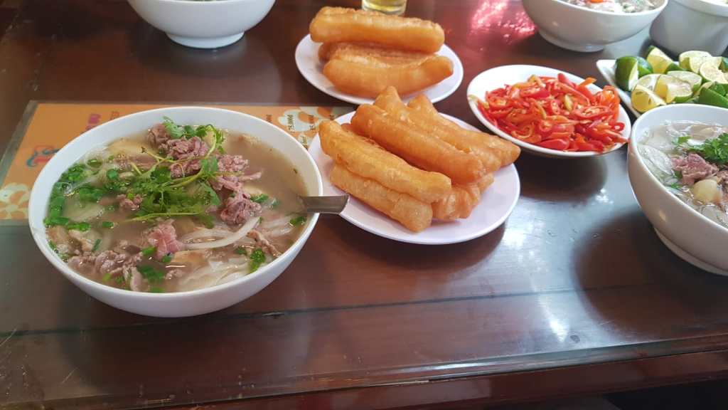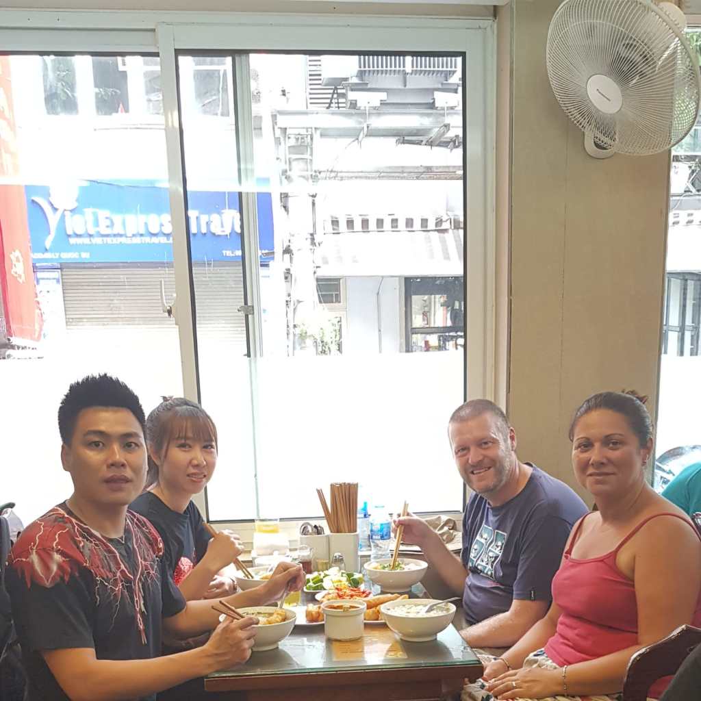 When thinking about Vietnamese food, most people will recognise the Vietnamese soup “Pho” which is what we went to find the very first afternoon we arrived. The place we were recommended was so packed we had to queue to get in and when we eventually did get a table, we shared it with this lovely young couple.