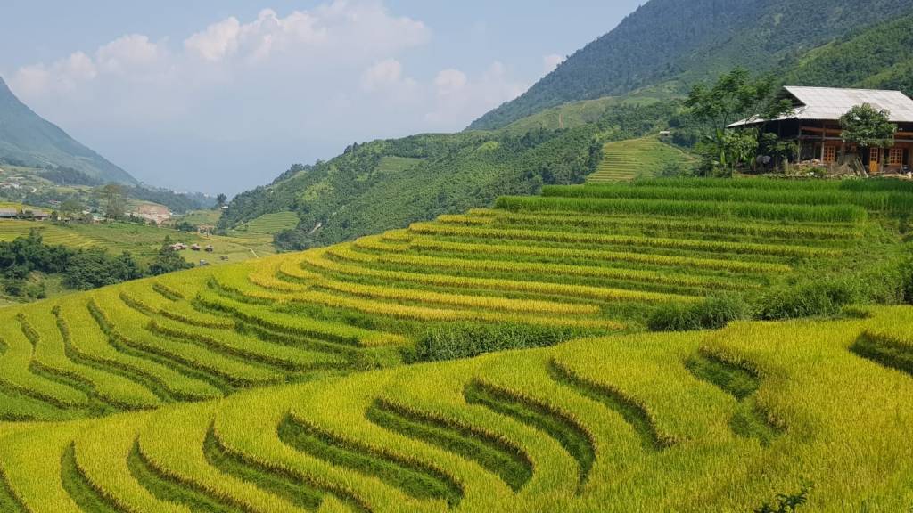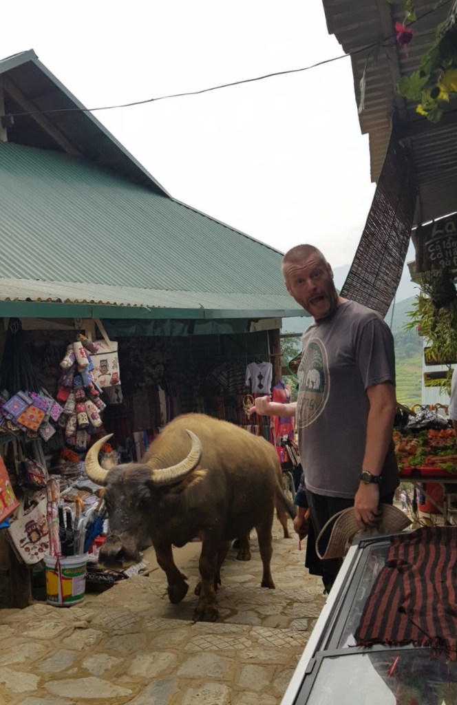 The walk that first day was amazing though, and everything we wanted out of this trip. Walking through tiered rice fields in a beautifully picturesque valley, across rivers by very wobbly bridges, through traditional Vietnamese villages witnessing the locals harvesting and drying their rice crop, and seeing buffaloes being herded. All such wonderful sights we’ll never forget.