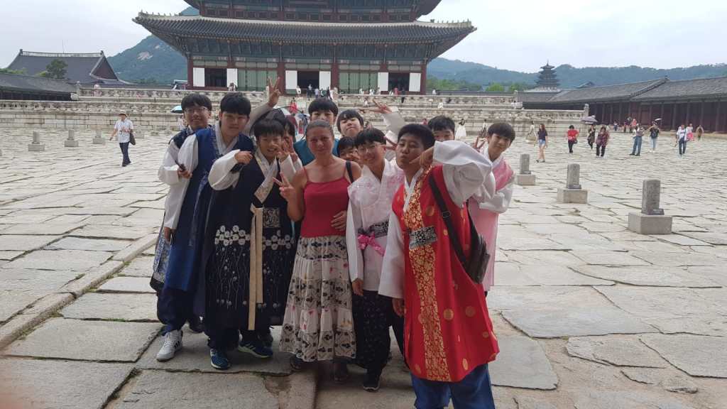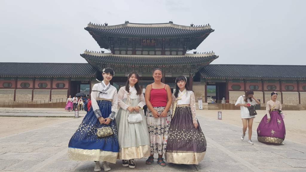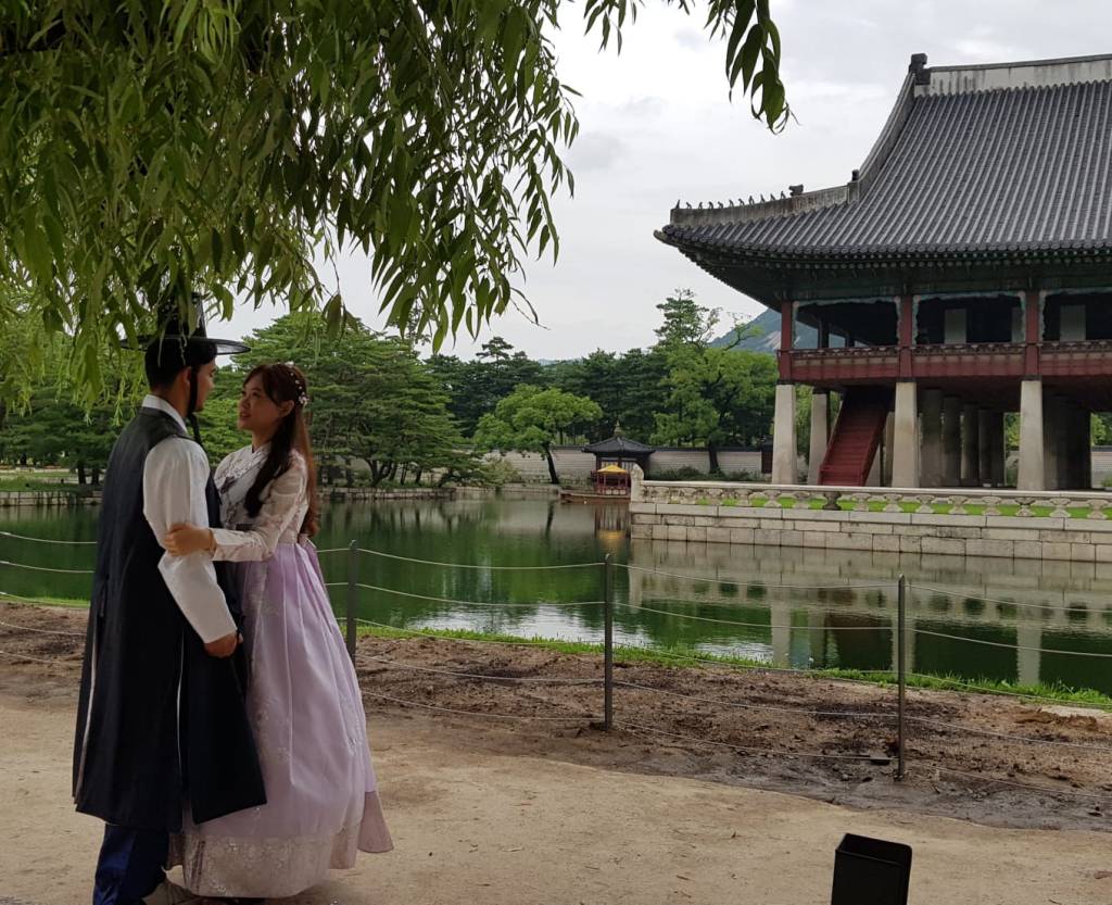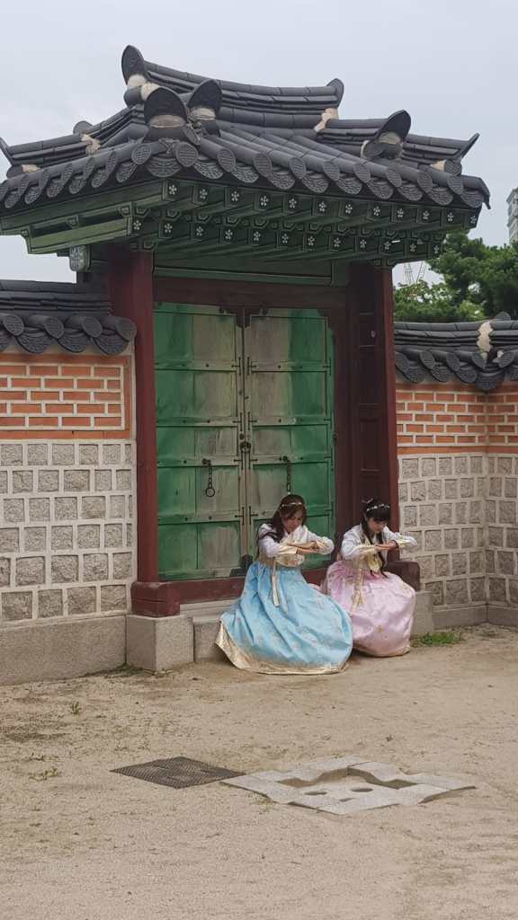 Seda: The next day was partly dry thankfully, so we thought we’d make the most of it. We walked to somewhere impressive we’d seen from the bus – Gyeongbokgung palace and the nearby national folk museum. They were both nice places to walk around, made even better by hundreds of visitors wearing traditional Korean costumes they hired for the day. We posed to camera with some of them, while some others were posing for their professional photographers which I might have gate-crashed.