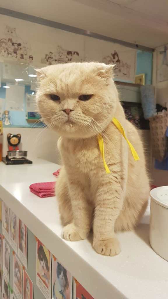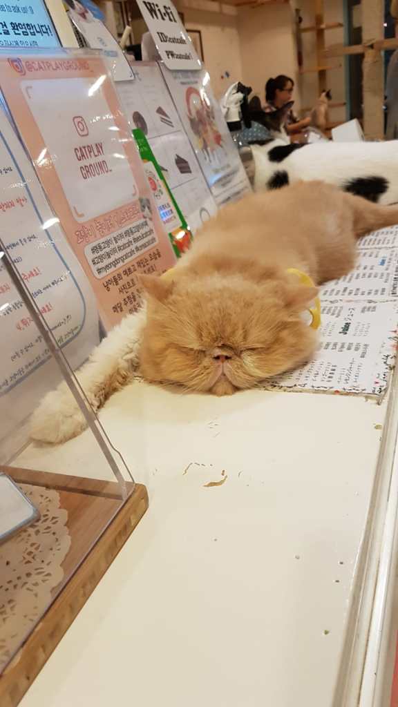 Seda: Constant rains were getting to us while we were walking on Myeongdong market street thinking it will pour down at any moment. We then saw this guy standing among the crowds dressed as a cat like a mascot at football games. Andy turned and said to me that he’d heard about cat cafes online and was curious about them. This was my opportunity. I had heard enough to drag him there! The cat guy was carrying a board saying that they had “50 cute cats” which I was rather sceptical about to be honest but when we got there however, I think there may have been even more!