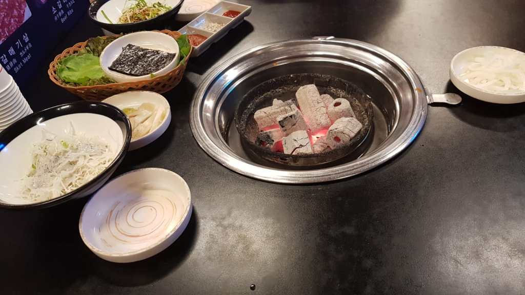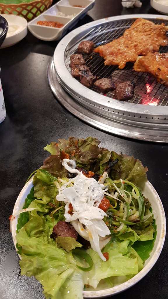 We haven’t really tasted anything that we would go crazy about except of course Korea’s most famous export -its barbecue. Although slightly expensive we were really keen to try and we certainly weren’t disappointed as it was delicious. We ordered some marinaded chicken, and beef skirt. All of the salad and condiments are free and obviously you cook the meat yourself. Not only is it great fun, but it tasted amazing too.