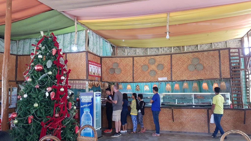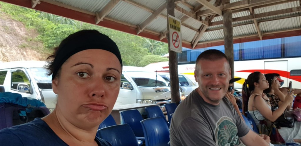 Seda: In order to get to El Nido in Palawan, we had a simple journey consisting of a jeepney ride, followed by a tricycle, a ferry, a taxi, a plane, a van and another tricycle ride. All in the spirit of fast approaching Christmas of course?! Here’s a photo of Andy in the payment queue of a local service station. The next photo is of us happily waiting for our already 20 mins late bus!