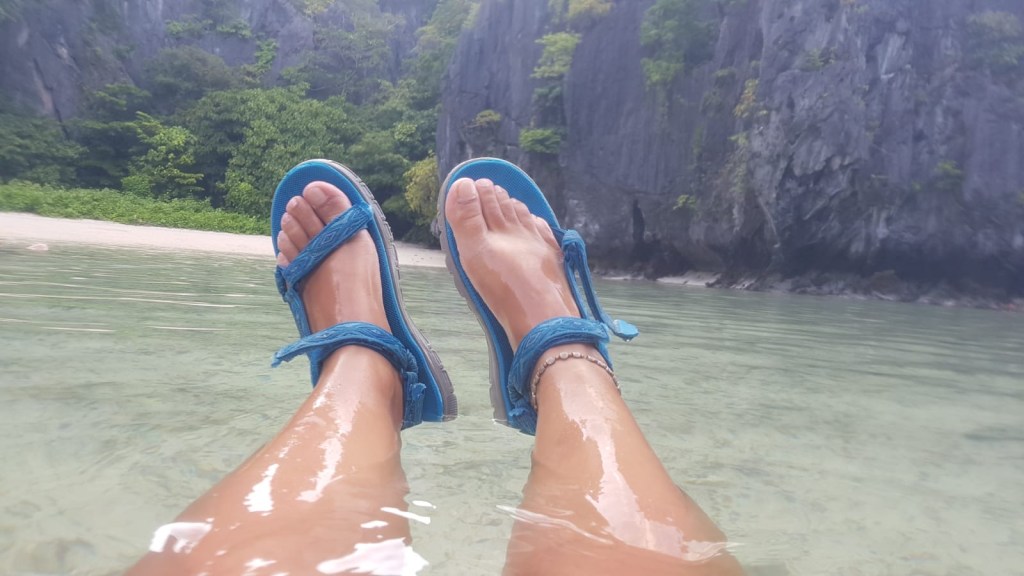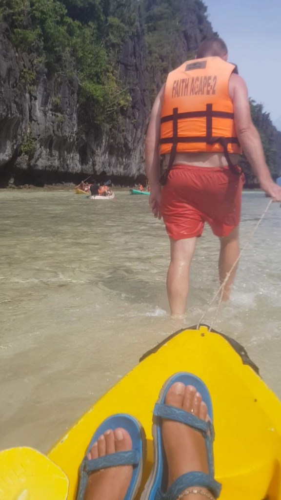 It felt as if the water had a grip on our possessions. Everything was falling off, our rings, our money through kayaking and even my sandals. During the first tour my loyal traveller sandals finally gave in as they had been threatening to do for a while. Whenever we had to walk/swim to the beach from where the boat stopped, we were asked to have footwear on to avoid the sharp rocks. In and out of the water, my poor sandals just didn’t make it through the day. Since we are now thrifty backpackers, buying a new pair didn’t even cross(!) our minds. Instead we thought we’d test out the quality of Filipino superglue matched with a night spent under the (considerable) weight of our bed. A repair I’m happy to report is still holding even after the second boat tour. Well, we repaired Andy’s sandals with a couple of my hairbands and that still seems to be ok!