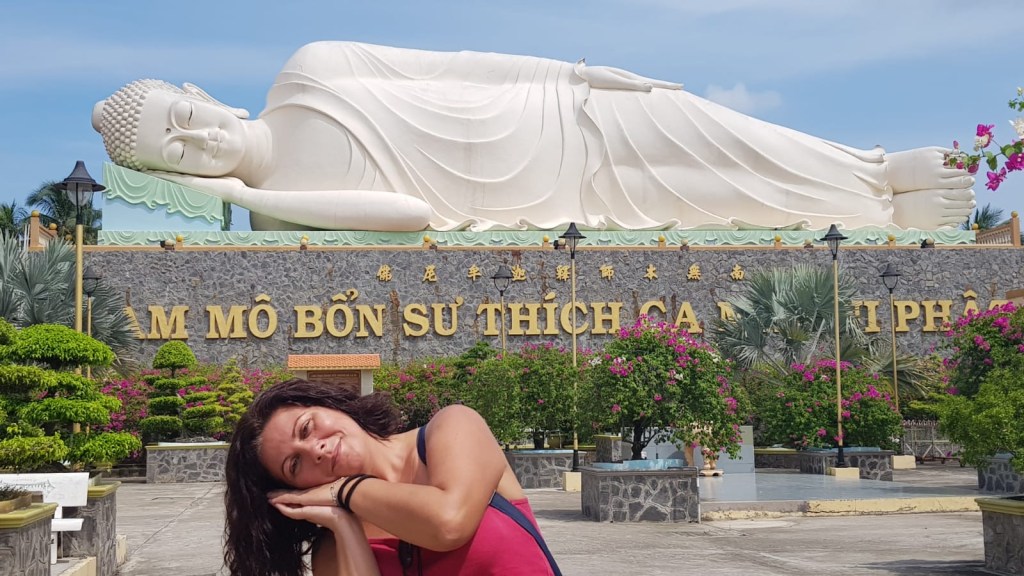 When we arrived into the Mekong Delta area we headed straight for a beautiful pagoda situated next to the mighty river. According to local legend, and of course our tour guide Linh, young couples who don’t have a baby would go there and pray for fertility. She also mentioned ladies “over 25 and still don’t have a boyfriend”, which made Melissa pose the question, “What about 47?”.