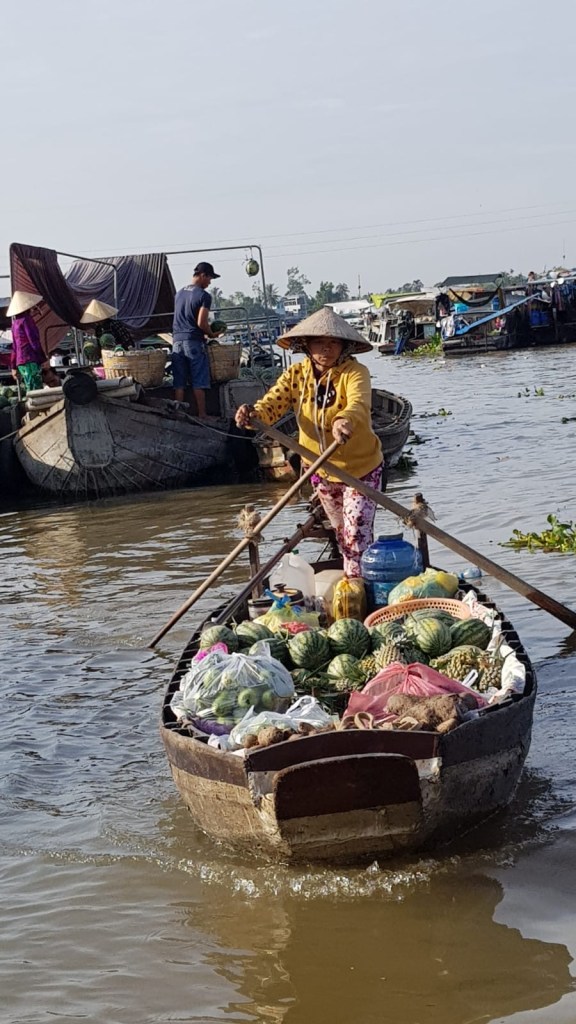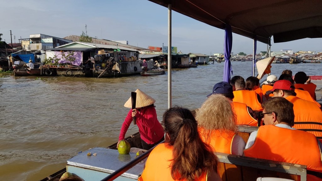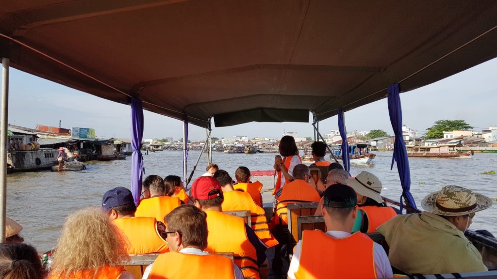 From the pagoda and it’s surrounding Buddha statues we went to the quayside and got onboard a rather tired looking wooden boat which looked like it was one stray floating coconut away from sinking. All of us had to constantly shift from side to side trying to balance the boat that never seemed to be level, which felt like a never ending game of musical chairs. This was all done by way of a request via microphone, and at one point Seda and Melissa moved to the other side. The look of joy on their faces when it made no difference was a sight to behold!