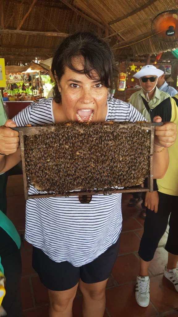 By far the best stops on that first morning was to a place which produced honey, and somewhere we we would try some tropical fruits and listen to traditional Vietnamese music. The honey tea we tried was lovely and we were also shown a section of the bee hive. We were invited to hold it, which I politely declined, but Melissa jumped at the chance. We had tried all the fruits before on our travels, but they were still very welcome. The music was good, and it’s always nice to listen to different things, but I don’t think I’ll be downloading it anytime soon.