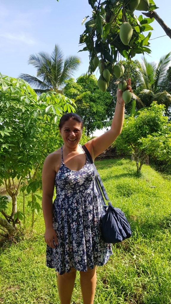 The boat did a loop and off we went leaving the floating market behind on our way to see an orchard. It was a lovely experience seeing the trees with their tropical mangos, jack fruits, rose apples, pamelo and cacao growing.
