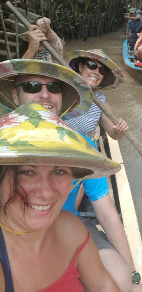 The last stop before lunch was a short canoe ride along one of the Mekong’s many feeder streams. Once we’d donned our traditional Vietnamese conical hats we definitely went faster, and of course looked the part.