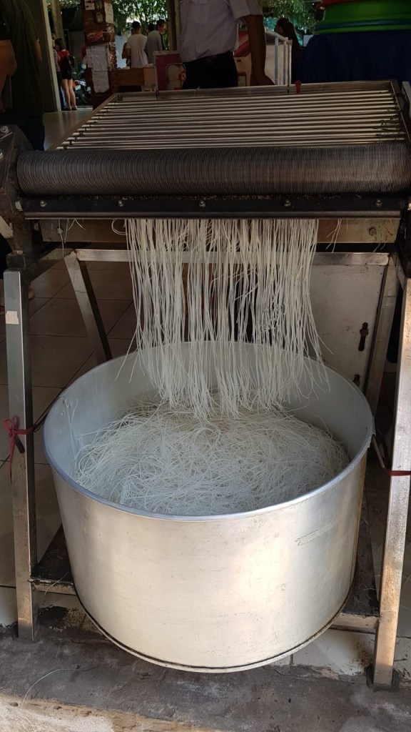 The last stop on our Mekong Delta tour was to a factory that produced rice noodles. We were both looking forward to this as we thought it sounded rather interesting, and we had no idea how it would be done. Basically they boil rice down to nothing – until it’s just a liquid. They then make a kind of crepe, and then leave it out to dry rock hard in the sun before shredding it into the rice noodle. One thing I found fascinating is that they used the rice husks to keep the fire going, so nothing was wasted at all. Very economical.
