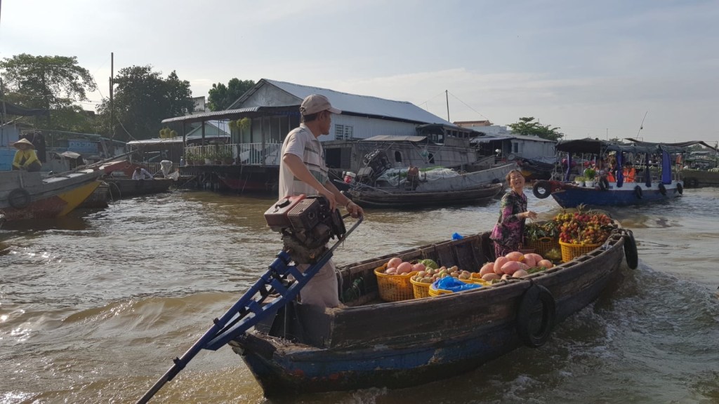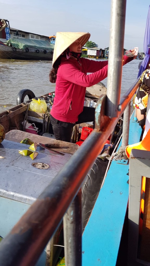 Breakfast was nice and simple. I guess we were all excited about going to the floating market that morning which is one of the highlights of this tour. When we got there though, it was a little different from what we each thought it would be like. Melissa had thought that there would be a floating platform with all the sellers on it where we would get off the boat and walk around which we didn’t. I thought we would be in a canoe mixing with all the sellers on their canoes. Andy also thought we would transfer to a smaller boat, but no, we stayed on the same boat. Some drink and fruit sellers came and hooked their canoe onto our boat and people bought a few things. The only seller that we stopped by was the Vietnamese breakfast seller where the local tourists gorged themselves in the lovely soup but we westerners just carried on working on the boat balance issues.