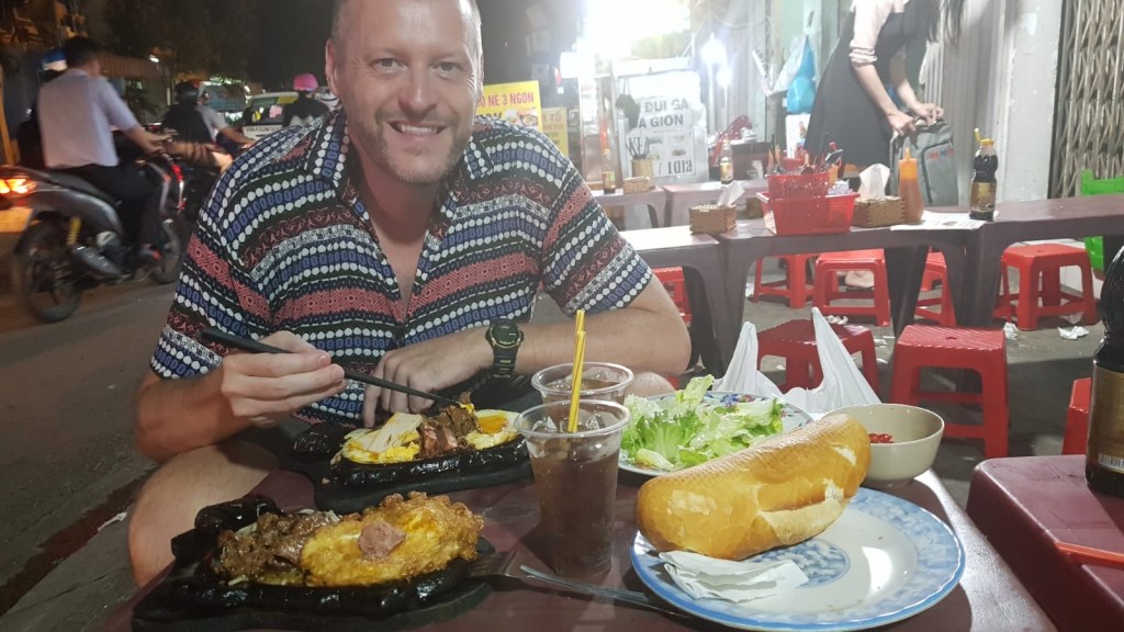 Later, we sat down at a pavement eatery that seemed to serve beef in a hot pot with onion and eggs. We know the Vietnamese word for beef so that was fine, but I challenged Andy to explain to them that I didn’t want my eggs runny and sat back to watch the show! Oh what fun that was to watch, back and forth with google translate, sign language and both the lady and Andy repeating everything loudly to each other in their own language. As if saying it again and again will make it understandable. By this point it’s rush hour and the traffic is building up right next to us and we’re choking on scooter fumes. I was seriously questioning our decision to sit on this street side place.