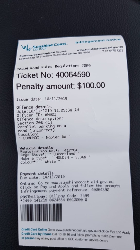 Eumandi market was nice but expensive. What we enjoyed the most was the guy playing country music and the nice chats we had with a few locals. The market is so large that it has stalls on both sides of the main road so when we had enough of the first bit, we walked to the other side. I was still complimenting Andy on his brilliant parking earlier when we saw a ticket on the windscreen. Parallel parking on reverse direction! Really? We now know that it is illegal to park in opposite direction in Australia. A knowledge that cost us a hundred dollars to acquire! Ouch…!