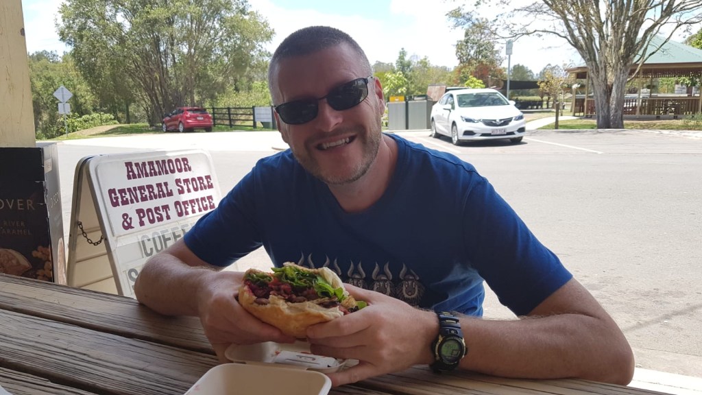 Andy: After our little walk in the forests outside Amamoor, we headed back to town and stopped at the tiny general store to pick up a few things. When we went to the till we noticed they had a huge menu of sandwiches, pizzas and burgers to name but a few, and very reasonably priced too. We were hungry, so decided to eat there. This proved to be a very good decision!