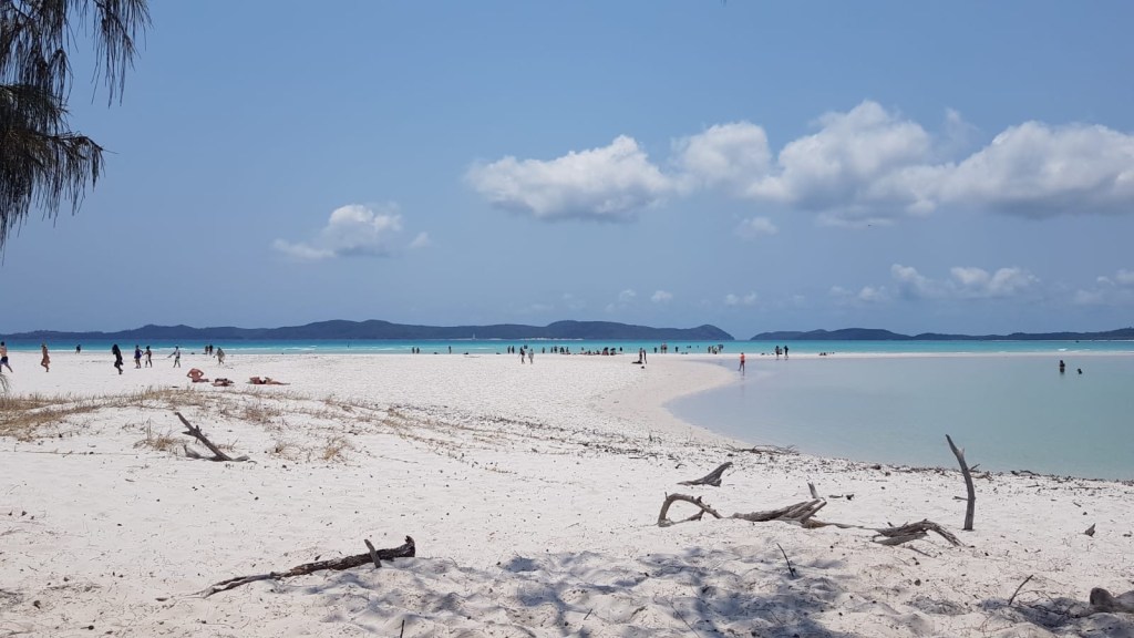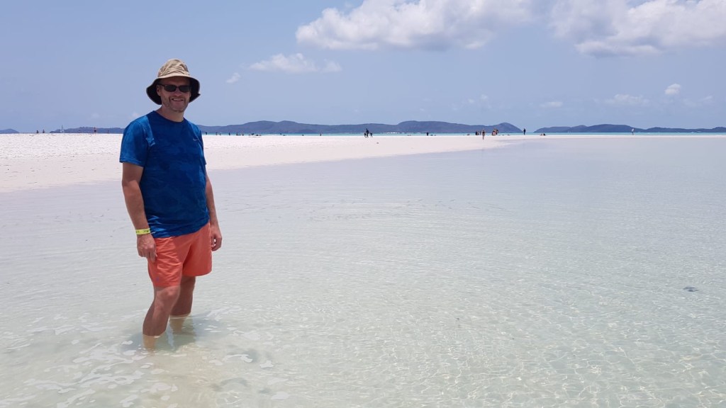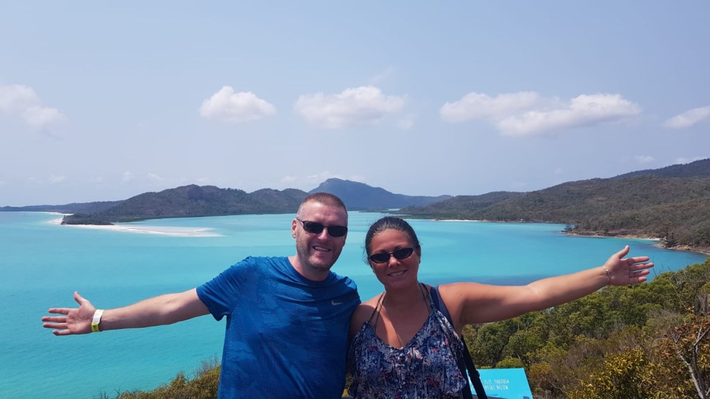 Andy: So, once the comedy of several people trying on dodgy looking full body zip up suits was over we got on board and off we went at great speed. Our first stop was the lookout point at Hill Inlet on Whitehaven Beach. The guides kept going on about the sand, and how pure it is. We just thought “yeah yeah, it’s sand, it’s soft, we get it”. After a short walk up some steps to the lookout point, we were blown away by the beauty of the place. It really is breathtaking. You just can’t take enough photographs and of course you have to jostle your way into the best spots.