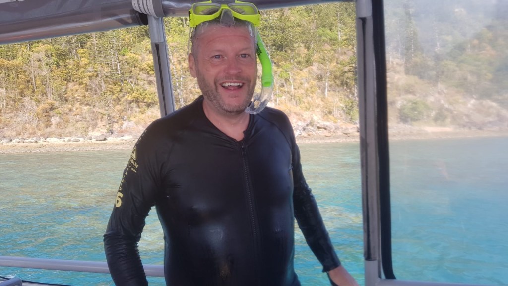The next day we went on our boat tour to the Whitsunday Islands. It was a chance to see the iconic Hill Inlet on Whitehaven Beach, but also do some snorkelling on the Great Barrier Reef. Firstly we had to try on a stinger suit. It’s like a wetsuit, but it’s designed to protect you from jellyfish stings as just by luck, it’s stinger season here! They were a bit, shall we say, fetish wear! But, if they protect us from the agony of a sting, then who am I to question the look!