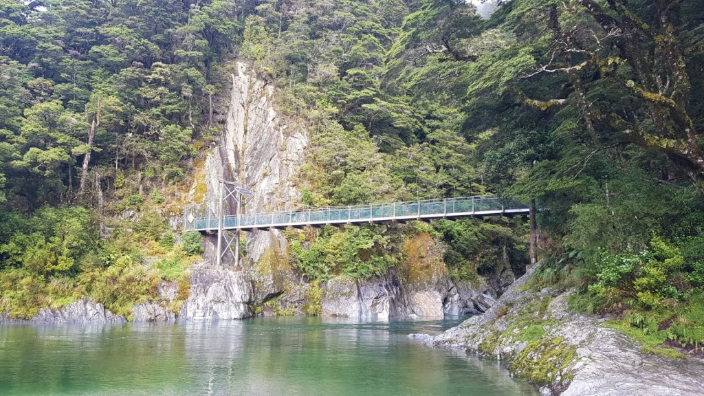 Although it is a little bit inland, we had to see Hokitika Gorge the next morning. As we didn’t have any rain the days leading up to our visit, the colour of water wasn’t as spectacular as it could have been but was still amazing! Andy went to stand in the middle of the swing bridge and I stayed at the viewing point to take his picture.